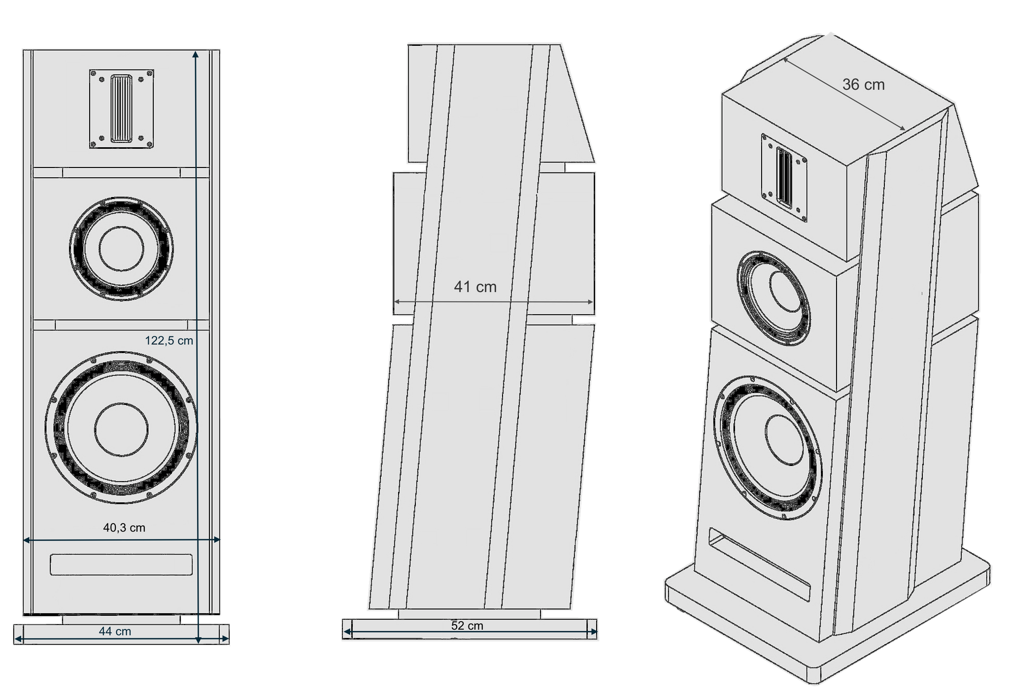 The cabinets, made of MDF consists of three independent boxes whose walls reach up to 4 centimeters thick. These boxes are interconnected by decoupling separations that ensure total control of vibrations. The offset positioning of the speakers has been calculated to obtain a perfect phasing.